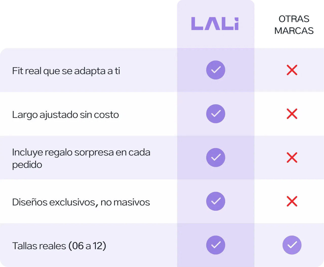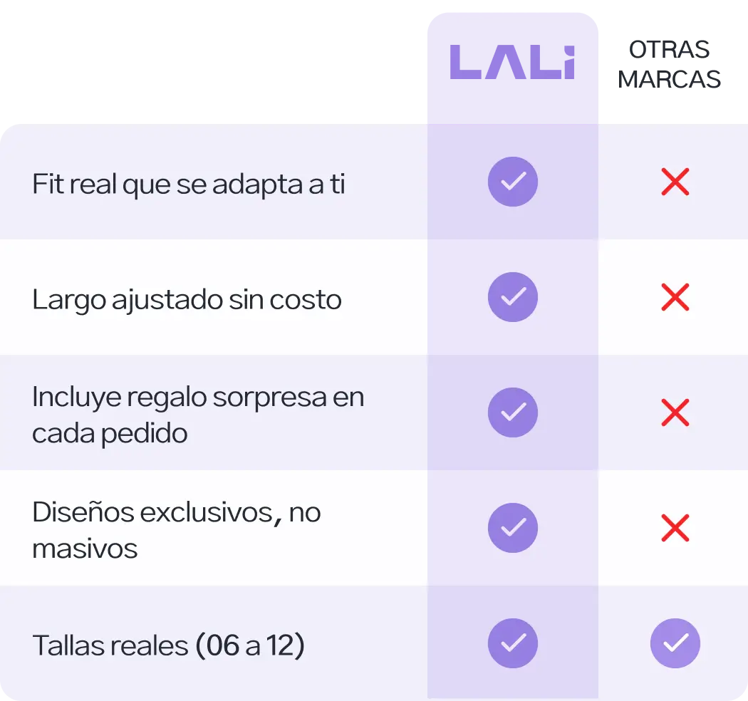 Lo sabemos: las tallas cambian en cada marca. Por eso, en LALÍ trabajamos con una Guía de tallas probada en mujeres reales, no en maniquíes. Si tienes dudas, puedes escribirnos por WhatsApp y una asesora te ayuda en minutos a elegir tu talla exacta. Y si necesitas cambiarlo, lo hacemos sin drama.